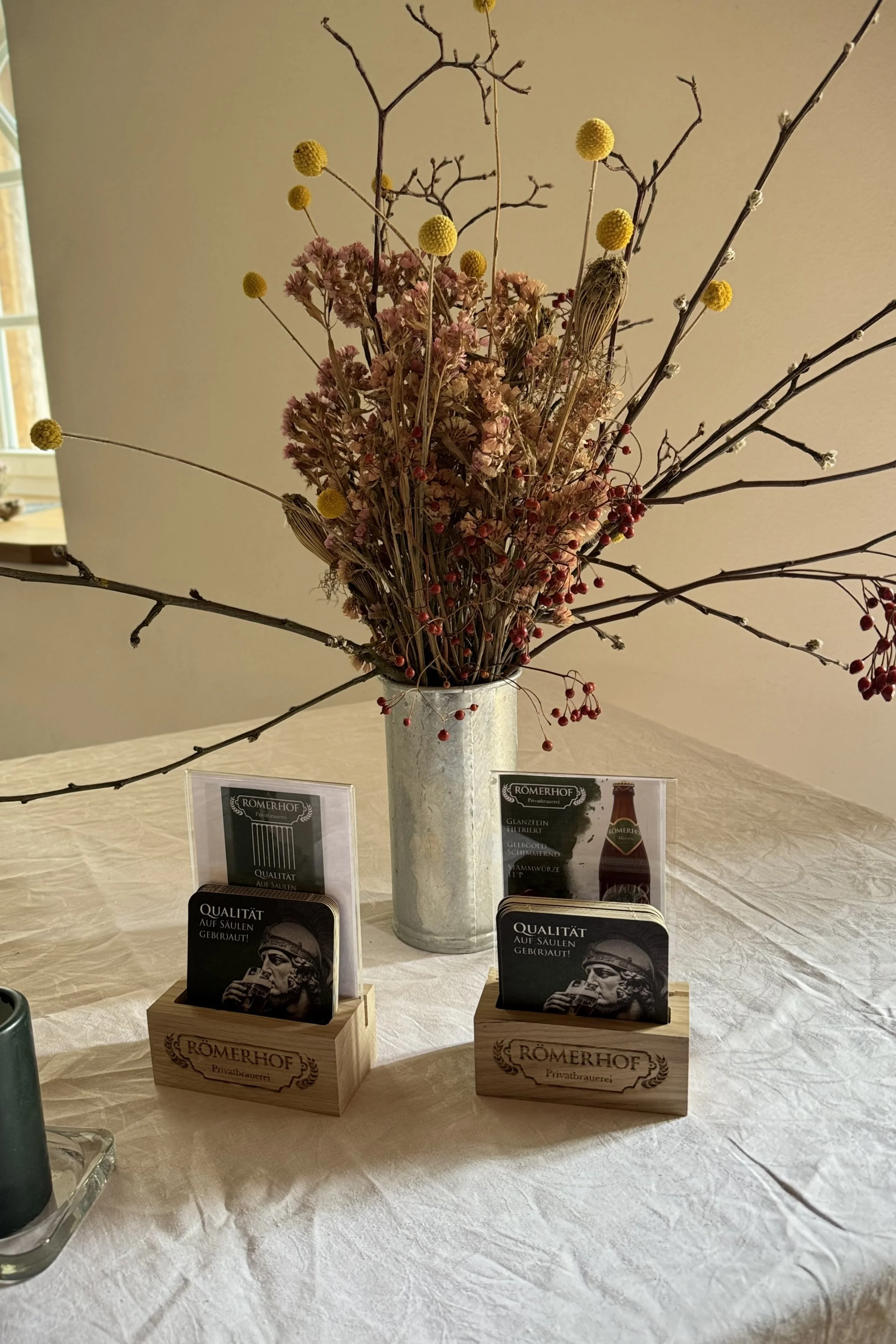 Zum Anstoßen gab es Regionales: Bier und Getränke von der Brauerei Römerhof. Dieser Abend markiert den Beginn einer festen Kooperation — alle künftigen Veranstaltungen des .kulturraumes werden exklusiv vom Römerhof beliefert.